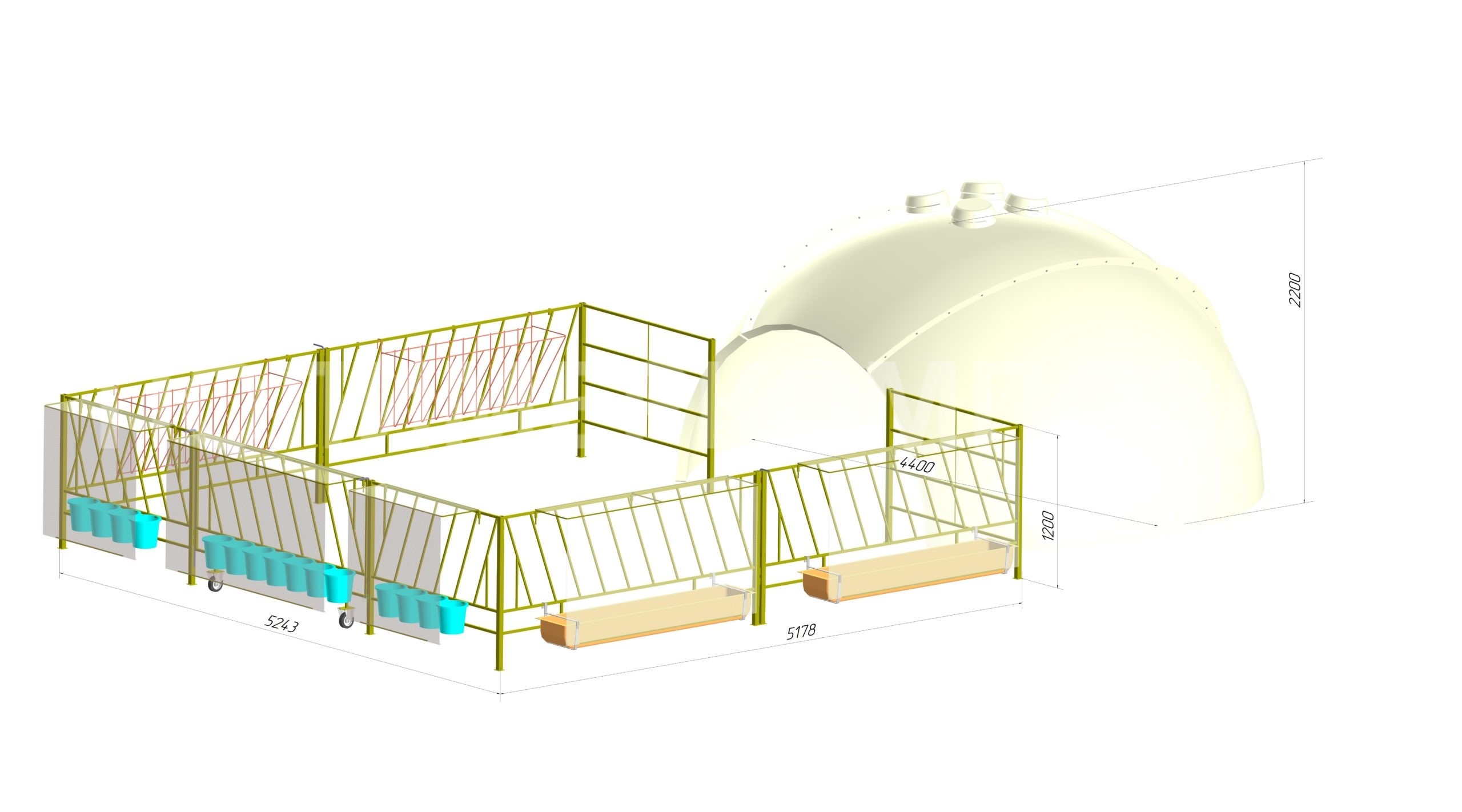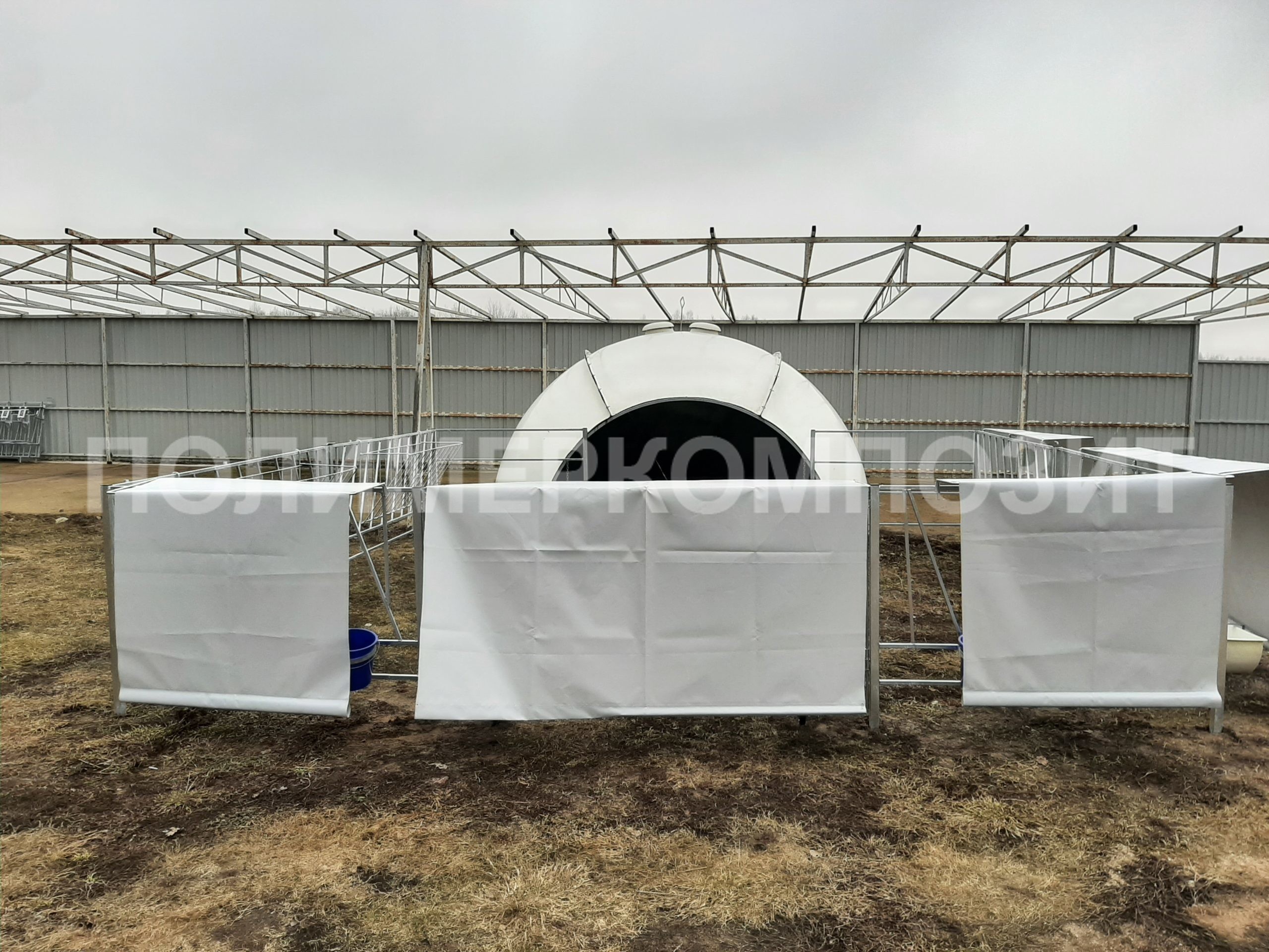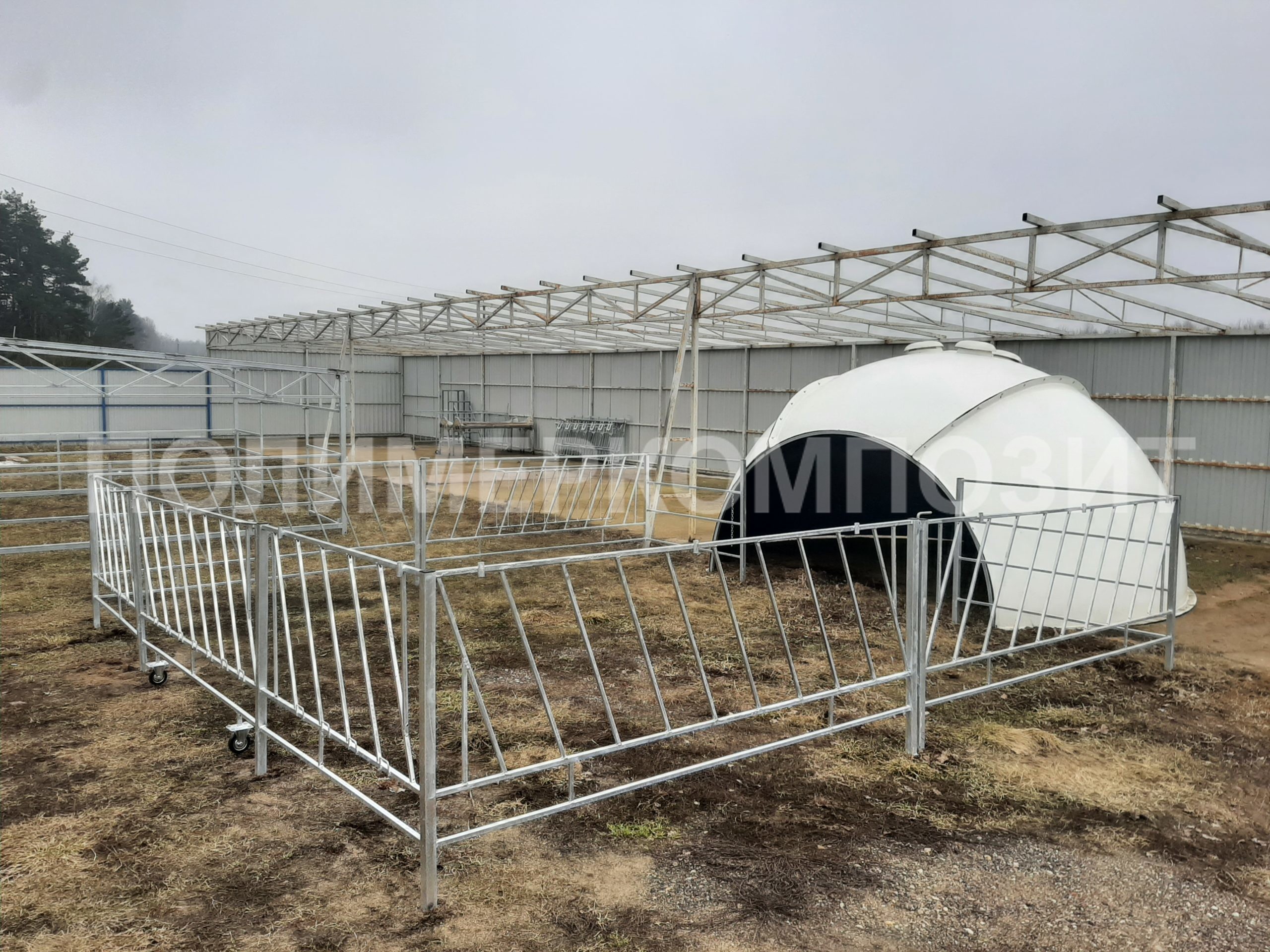 Групповой домик позволяет выращивать телят на свежем воздухе в группах до 15 голов до 5-6 месячного возраста. Групповой домик представляет собой полусферу с поддерживающей металлической аркой. Лаз полукруглый, оборудован защитными полистирольными шторками. Конструкция домика состоит из трех частей, что делает удобной транспортировку и монтаж. Для возможности передвинуть домик в собранном виде в центральном лепестке предусмотрен рым – болт. В центральном лепестке выполнены четыре вентиляционных клапана, диаметром 32 см с защитными крышками.