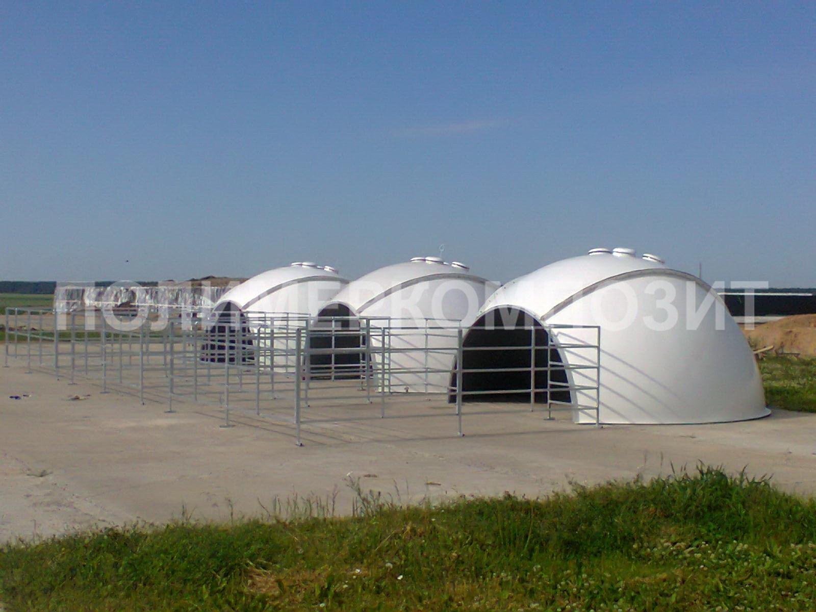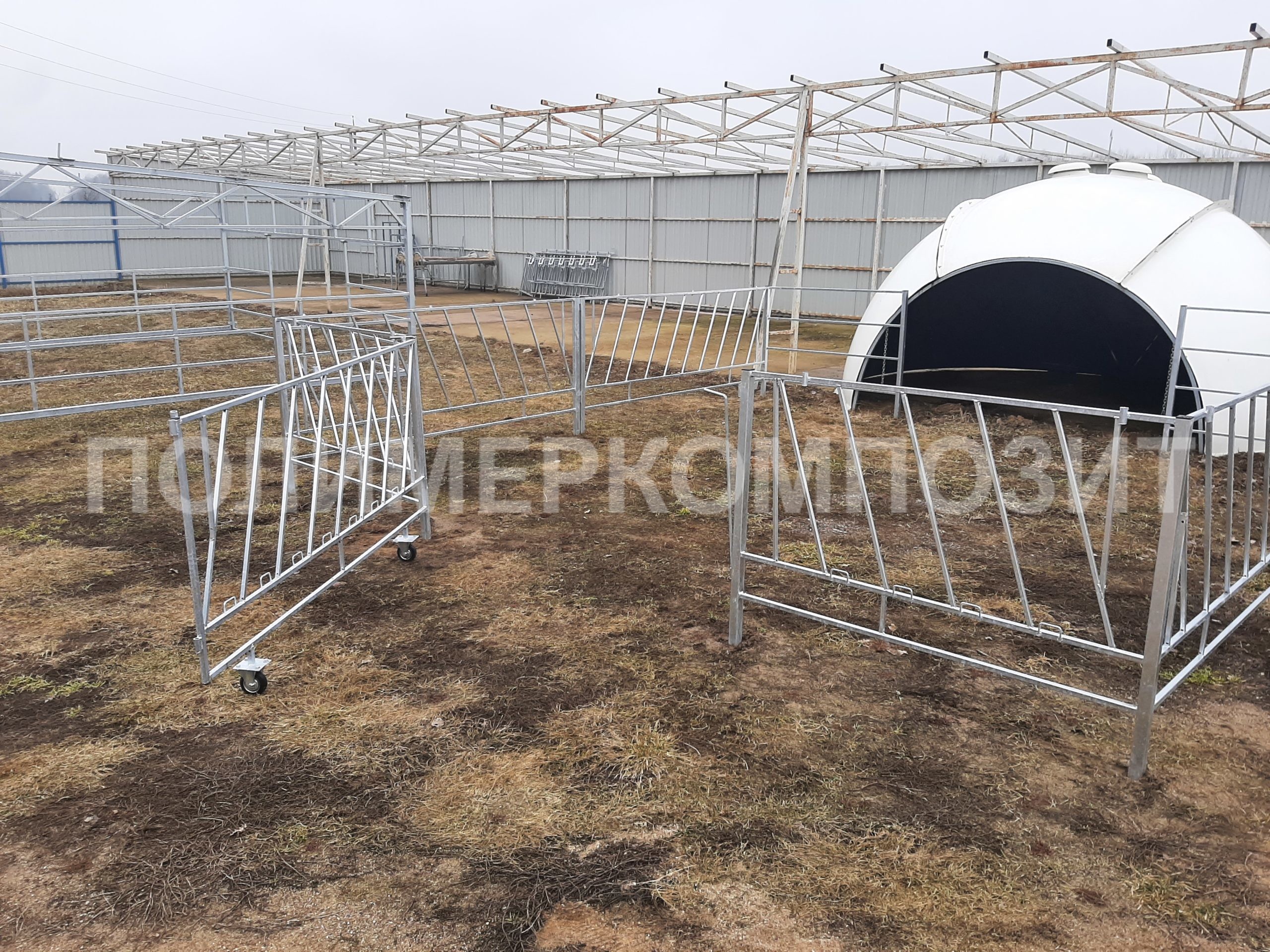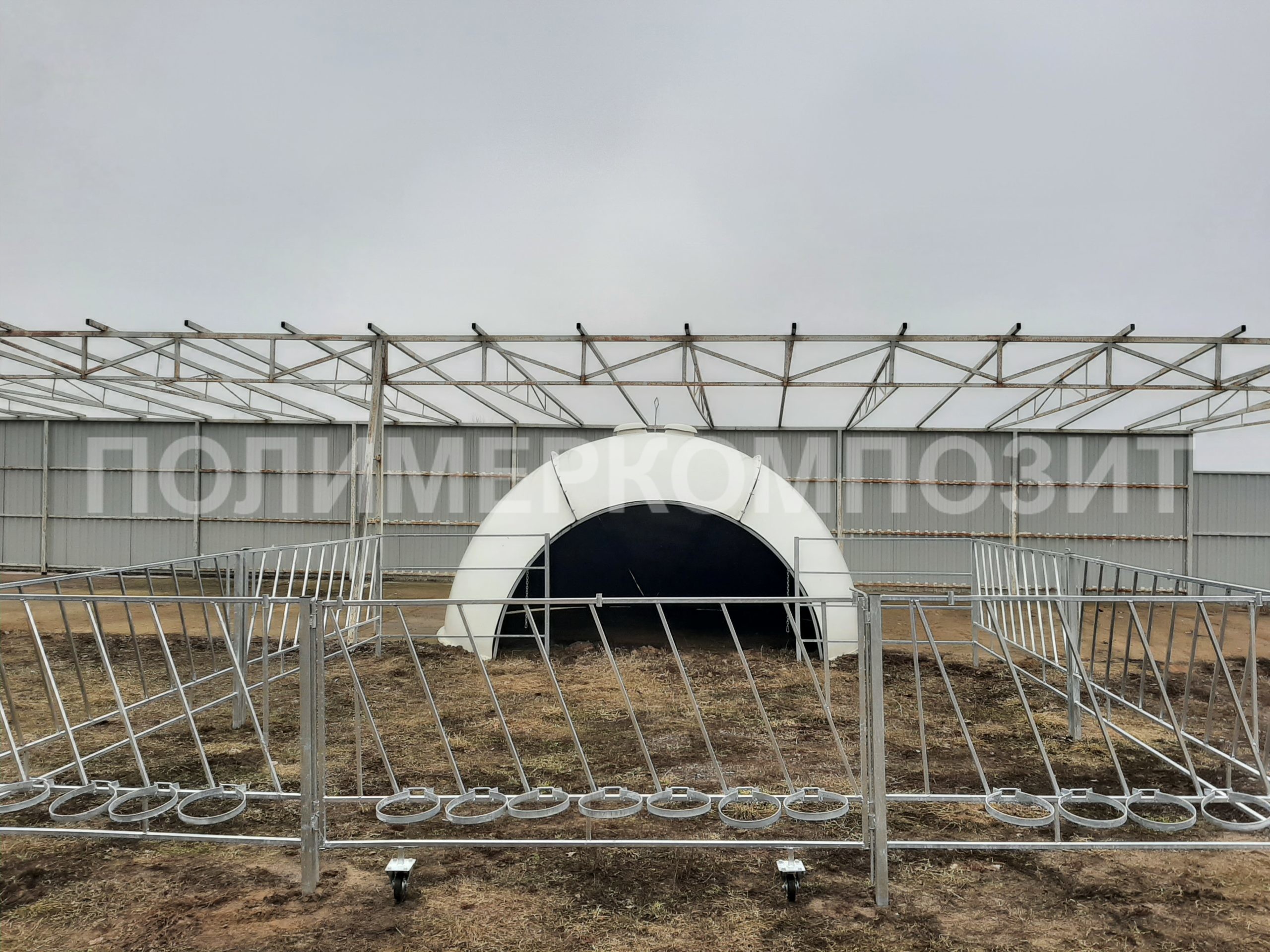 Групповой домик позволяет выращивать телят на свежем воздухе в группах до 15 голов до 5-6 месячного возраста. Групповой домик представляет собой полусферу с поддерживающей металлической аркой. Лаз полукруглый, оборудован защитными полистирольными шторками. Конструкция домика состоит из трех частей, что делает удобной транспортировку и монтаж. Для возможности передвинуть домик в собранном виде в центральном лепестке предусмотрен рым – болт. В центральном лепестке выполнены четыре вентиляционных клапана, диаметром 32 см с защитными крышками.