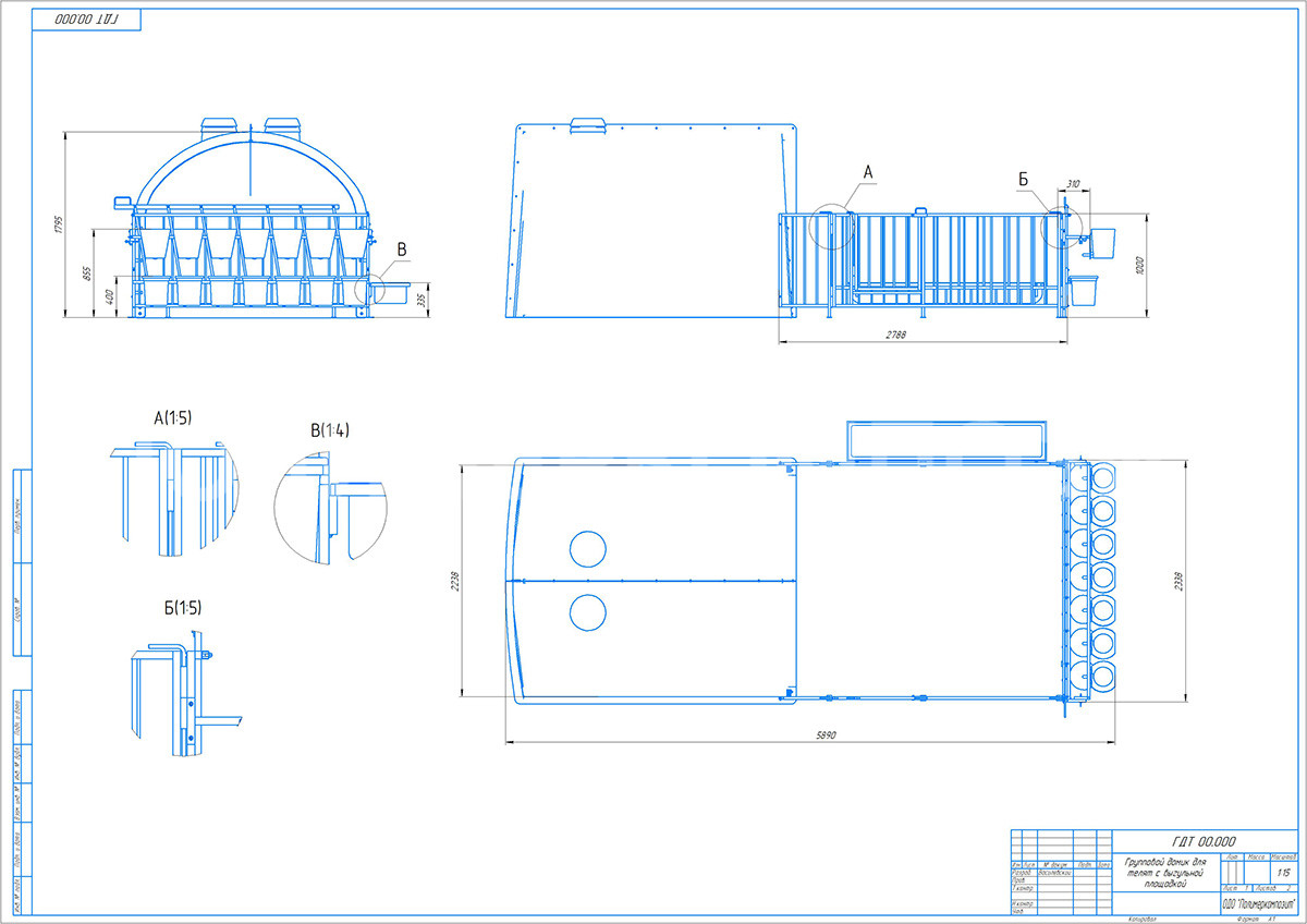 Благодаря продуманной конструкции и оптимальным размерам, в таком домике можно одновременно содержать до 7 телят возрастом от 14 дней до 5 месяцев. Групповой домик имеет увеличенный вход, который может быть снабжен защитными шторками из специального материала. В верхней части домика имеются два вентиляционных клапана с защитными крышками.