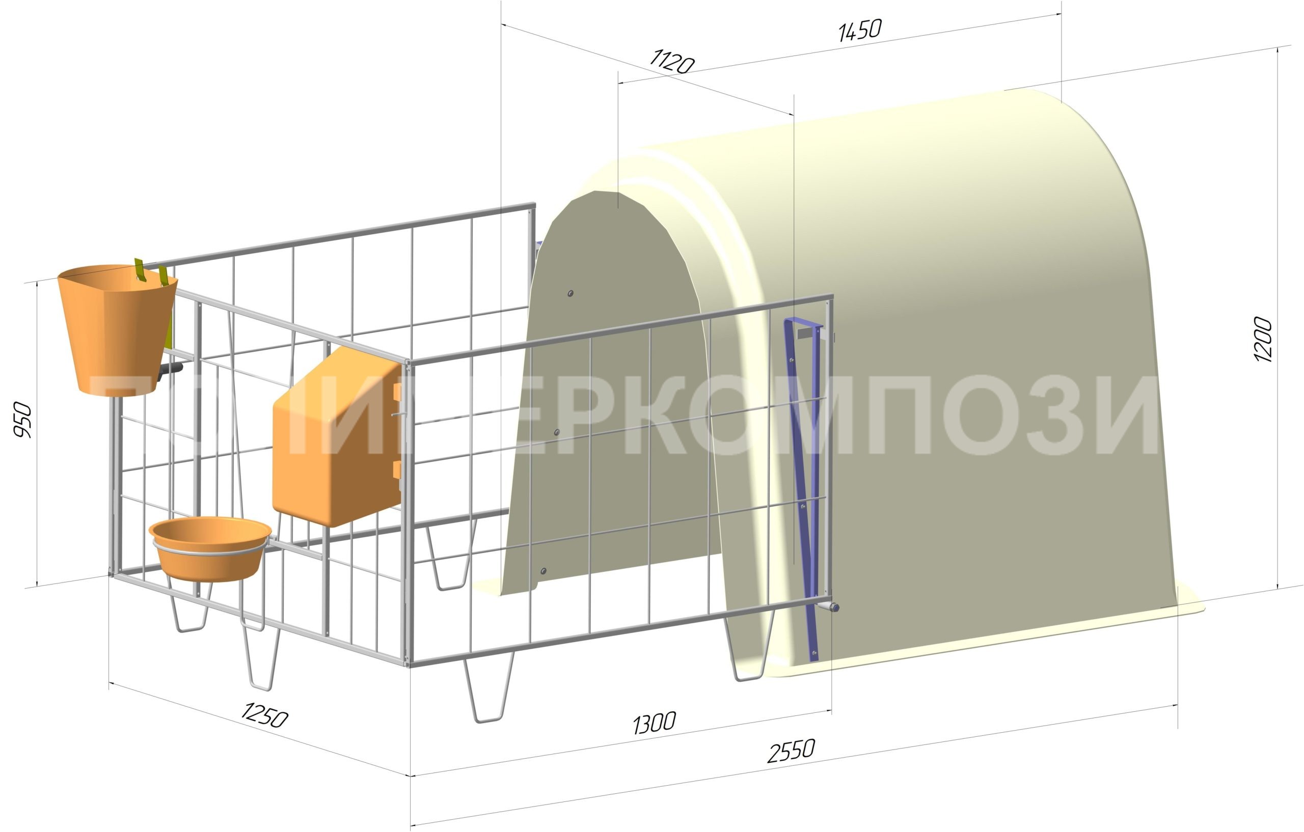 По желанию в комплект к ограждению может входить ведро с соской, кормушка для концентратов с крышкой, тазик.